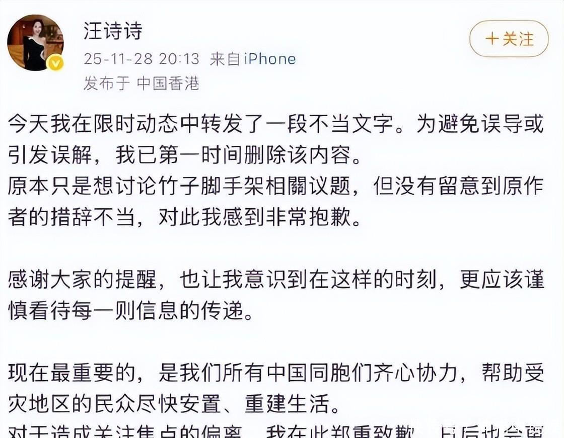 她最开始还没当回事儿,但架不住她在社交媒体账号上的言论被一众网友转发,眼看这事越闹越大,她就只能发文道歉。只可惜,汪诗诗这次的道歉,网友根本不愿意买账。