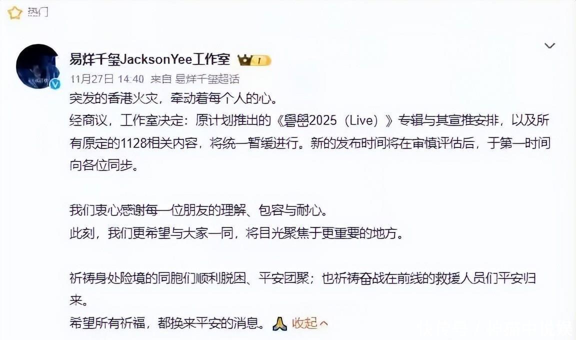 别人不说,就说号过生日的易烊千玺,他的生日正好和香港火灾撞在了一起。原本易烊千玺打算在这次生日好好的庆祝一下,甚至还打算在生日当天发专辑来回馈粉丝。结果他工作室知道这件事儿之后,第一时间暂停了发专辑。